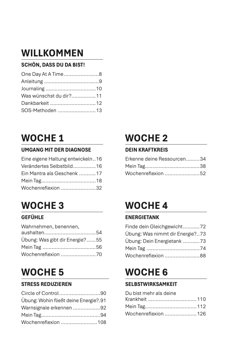 Das One Day At A Time Journal bietet eine wertvolle Ergänzung zur medizinischen Behandlung, indem es Betroffenen und ihren Angehörigen hilft, eine Haltung zur Erkrankung zu entwickeln, die eigene Selbstwirksamkeit zu stärken sowie bestehende Ressourcen zu erkennen und zu nutzen.